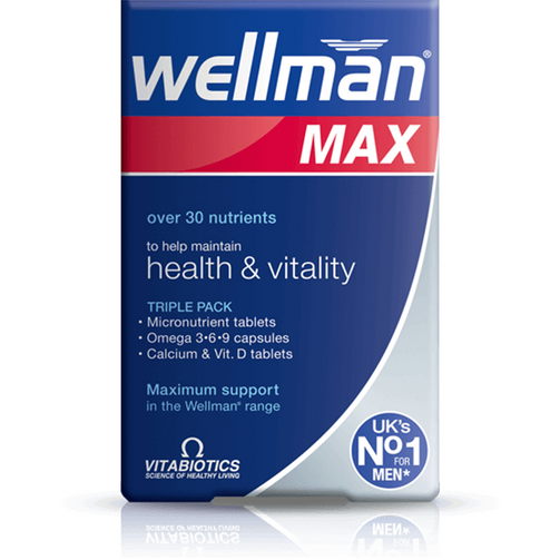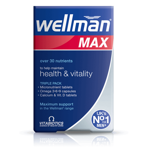 Wellman Max provides maximum support with a convenient 3-in-1 triple pack: -Advanced Wellman micronutrient vitamin and mineral tablets x 28 -High purity Omega 3-6-9 capsules x 28 -Calcium and vitamin D tablets x 28